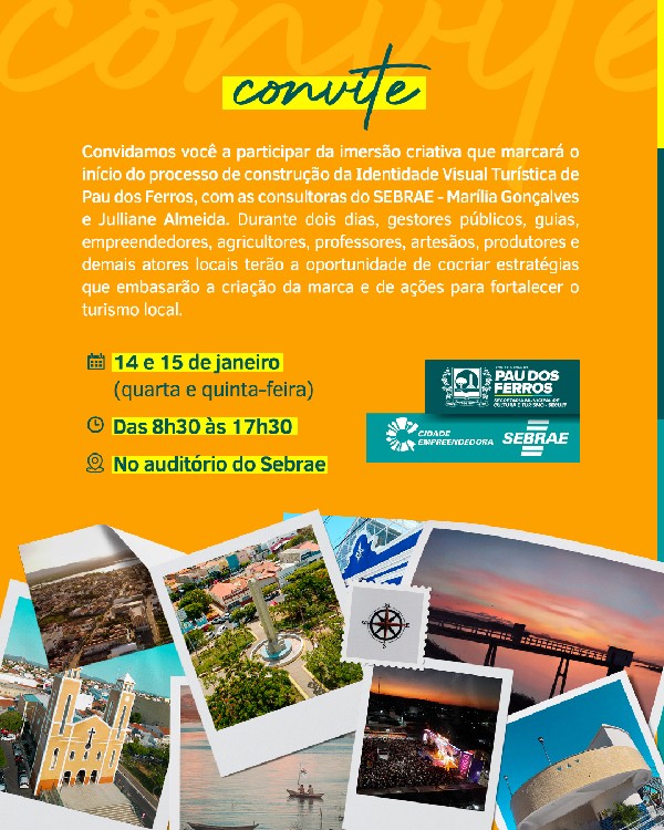 A Prefeitura de Pau dos Ferros, por meio da Secretaria Municipal de Cultura e Turismo, realizará, nos dias 14 e 15 de janeiro, uma imersão criativa que marca o início do processo de construção da Identidade Visual Turística do município. A ação integra o Projeto Cidade Empreendedora, desenvolvido em parceria com o SEBRAE.