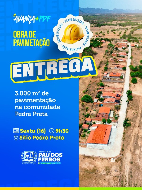 A Prefeitura de Pau dos Ferros realiza, nesta sexta-feira (16), às 9h30, a entrega da obra de pavimentação na comunidade Pedra Preta, na zona rural do município. A ação integra o programa PDF + Rural, considerado o maior investimento já realizado na zona rural pau-ferrense.