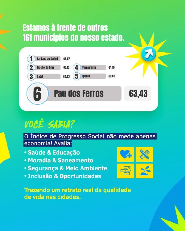 O desempenho de Pau dos Ferros no ranking evidencia avanços importantes nas políticas públicas e reforça o compromisso do município com a melhoria contínua da qualidade de vida da população.